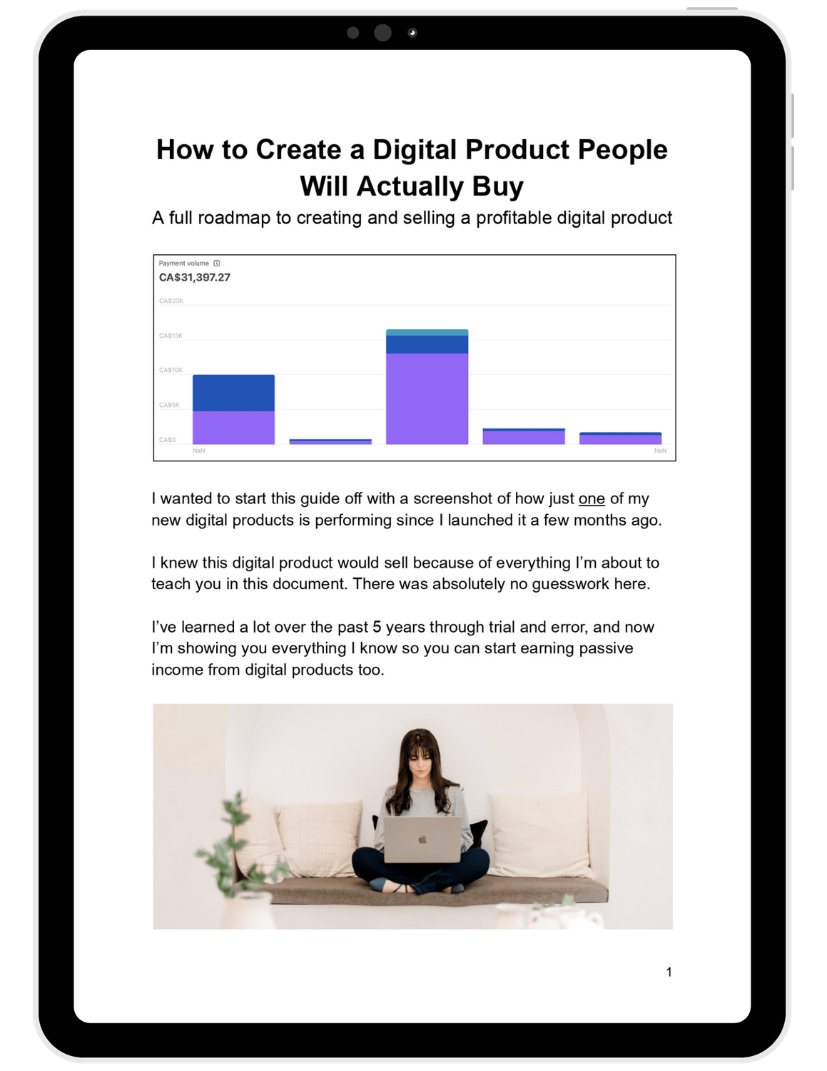 This 36-page guide will help you create a digital product that's guaranteed to sell. No more guesswork. I've taken my 5 years of experience and put it into this free guide so you can start making passive income with digital products too.